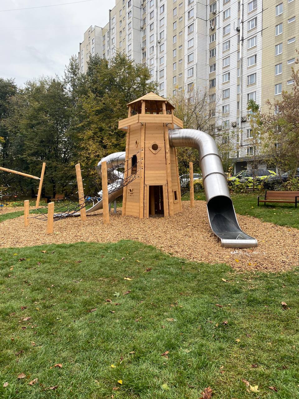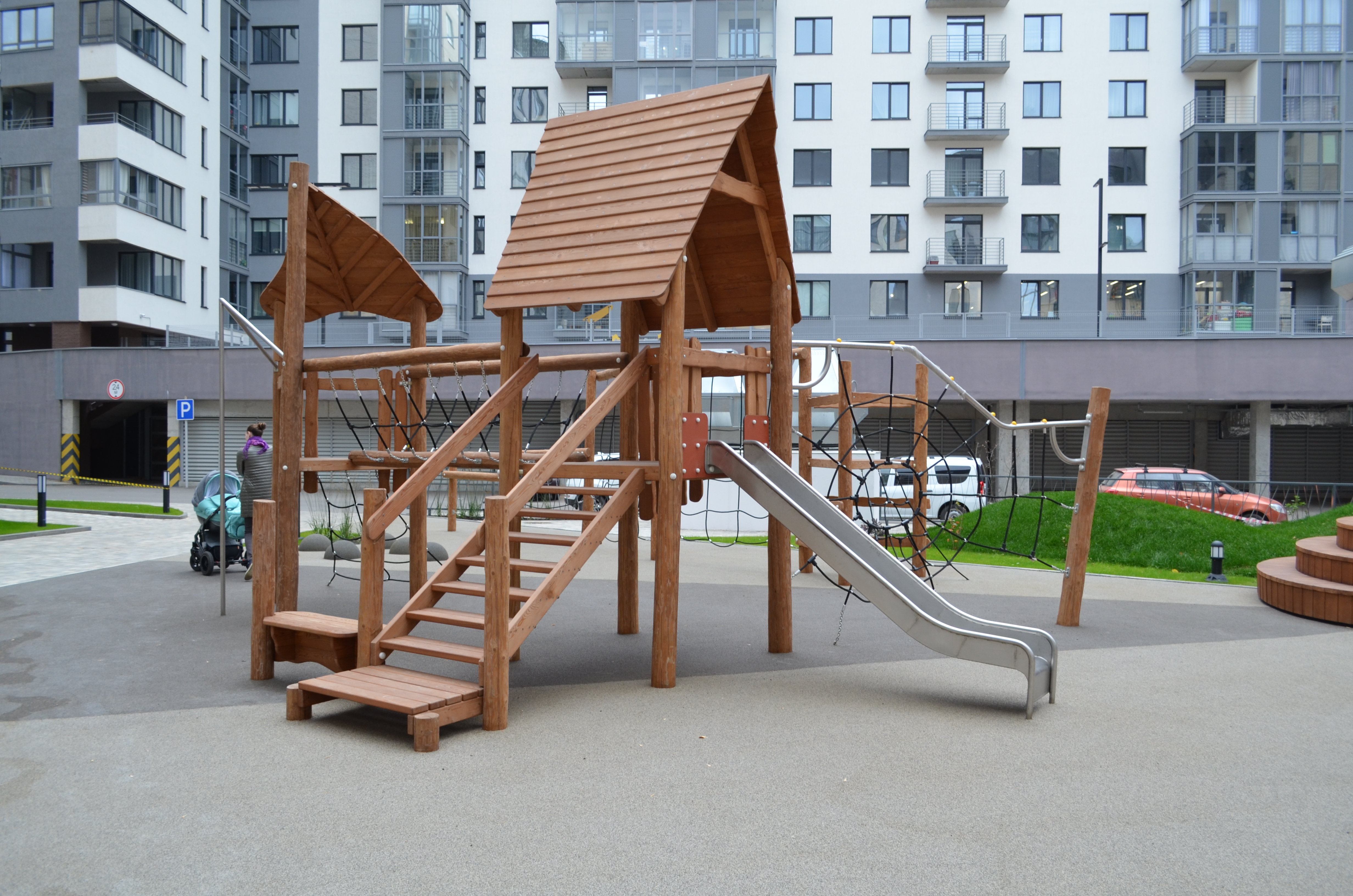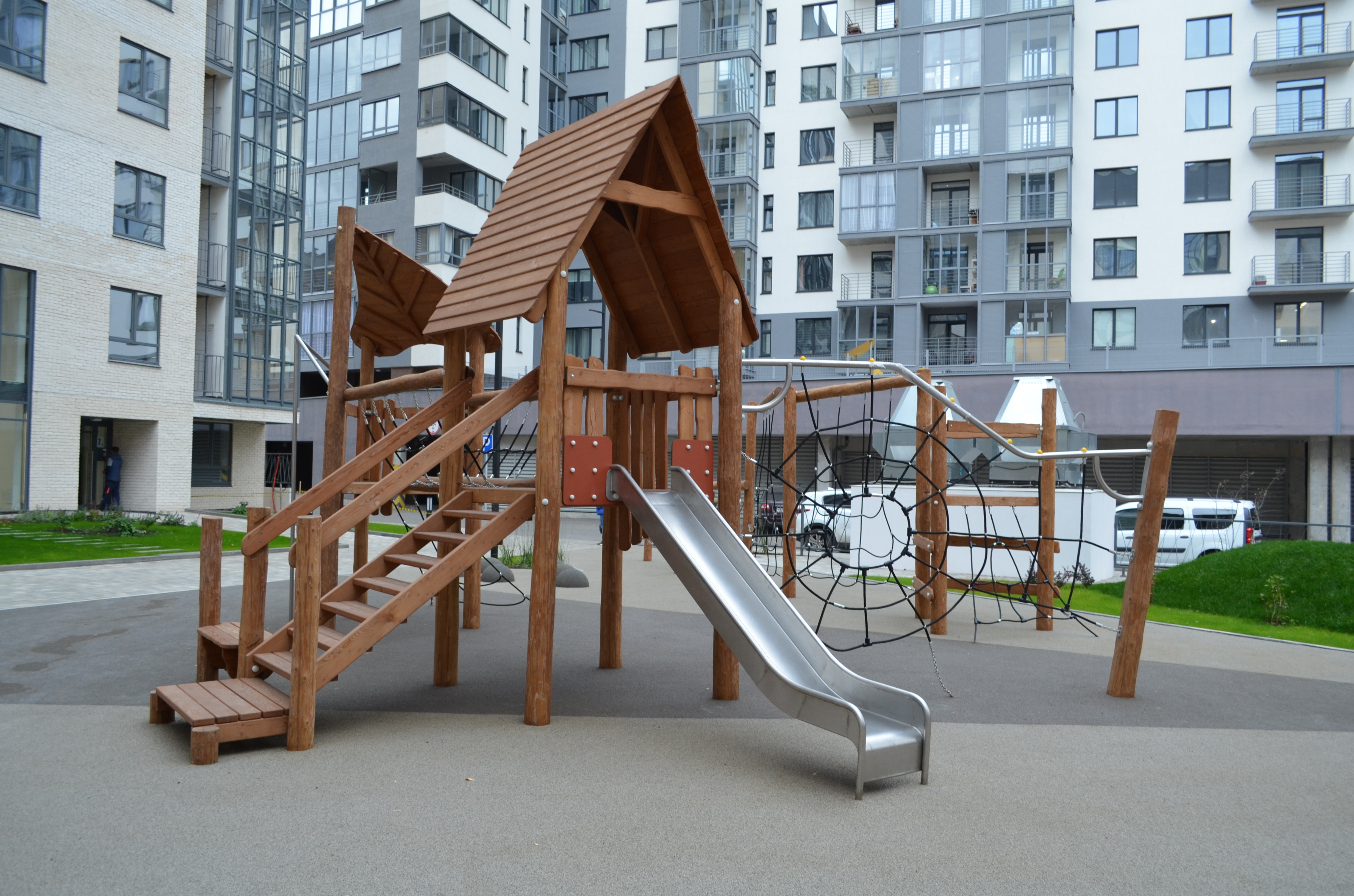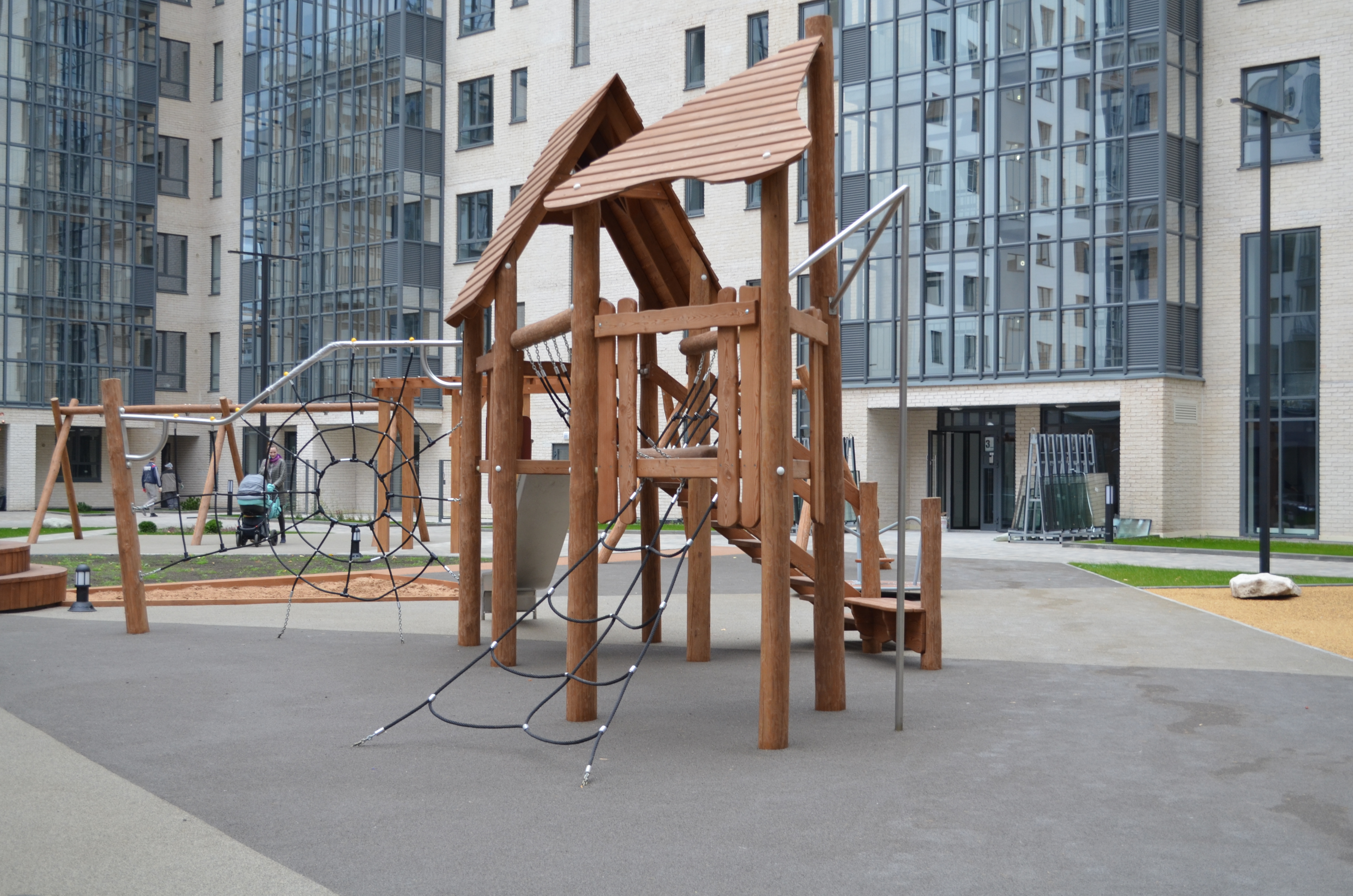 - Интерактивный дизайн: Игровые домики, крепости и замки должны стимулировать воображение и ролевые игры детей. Это могут быть тематические элементы, такие как башни, мостики, ступени и смотровые площадки.