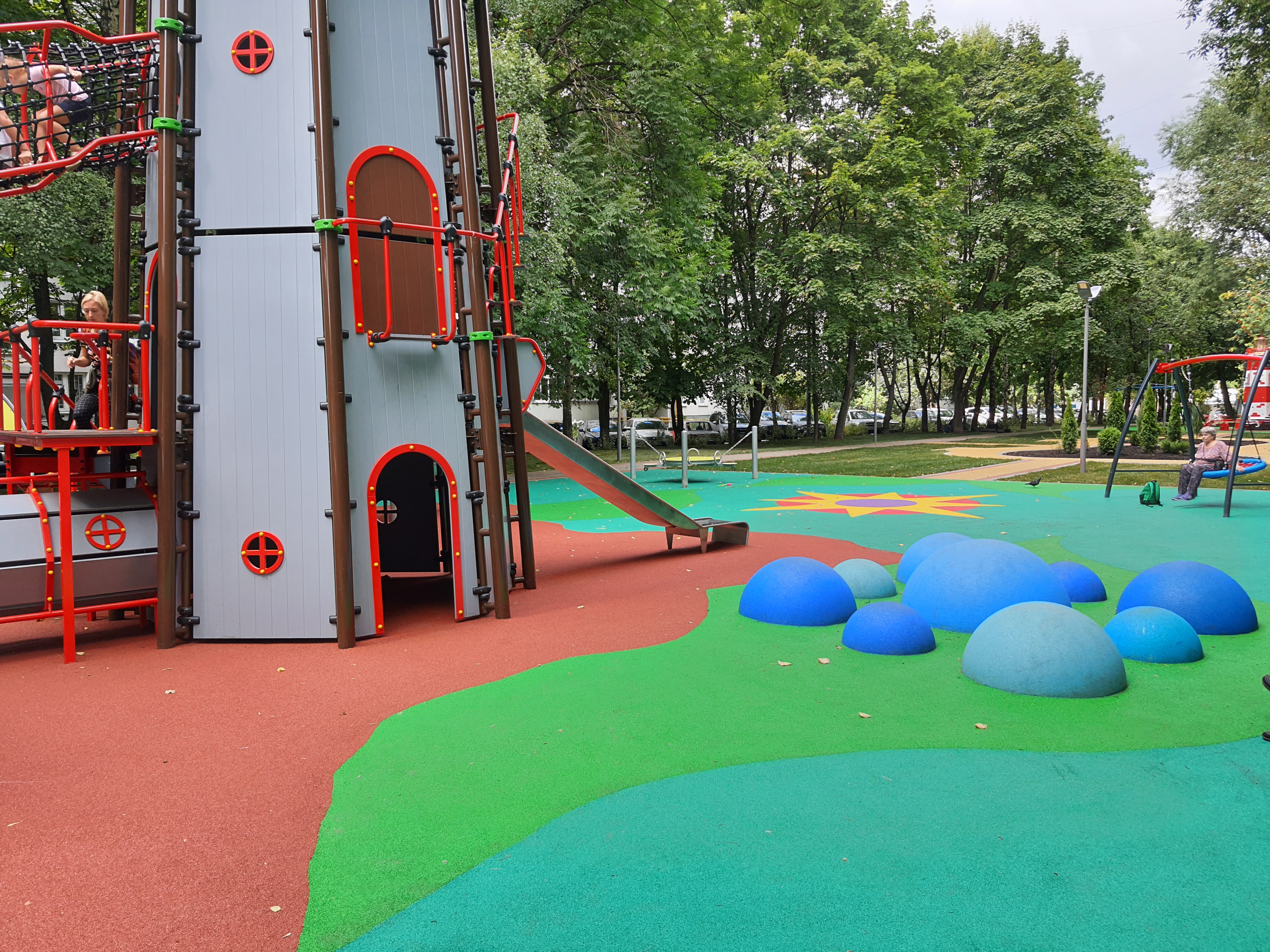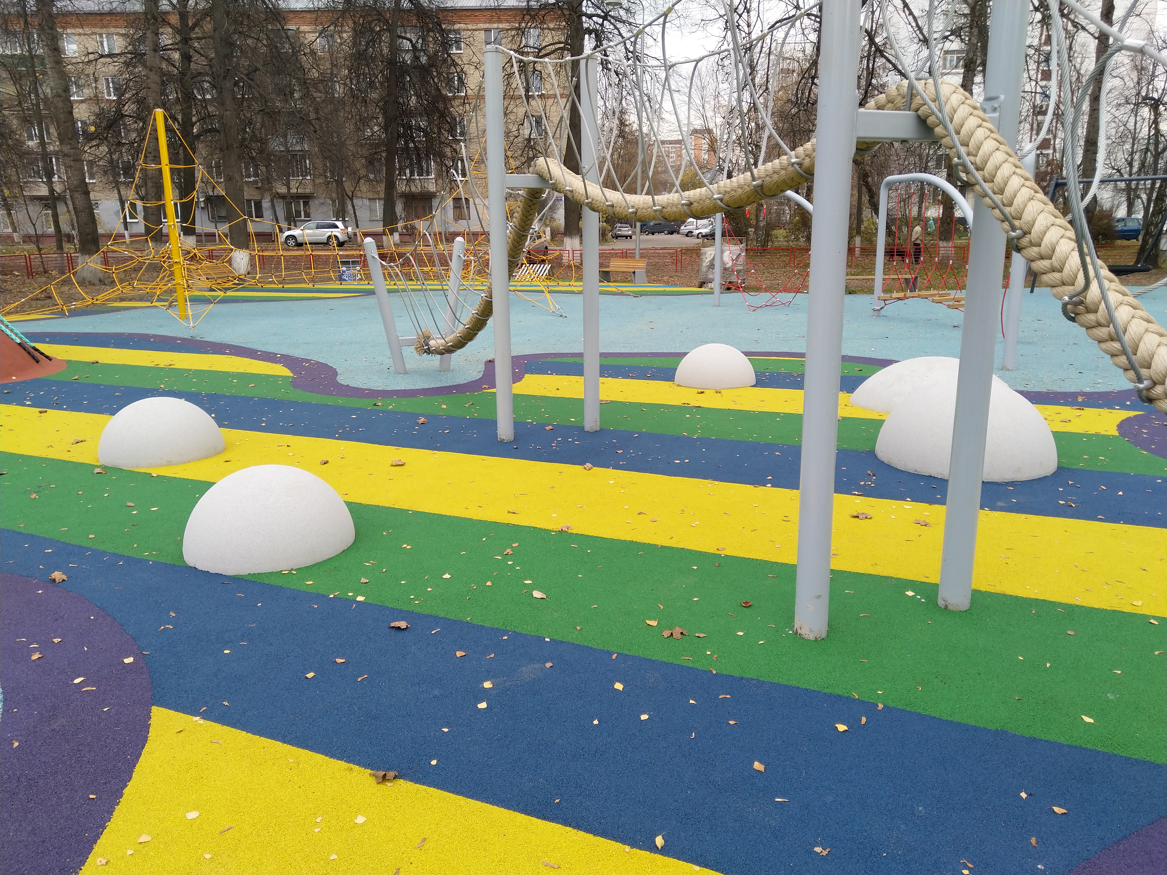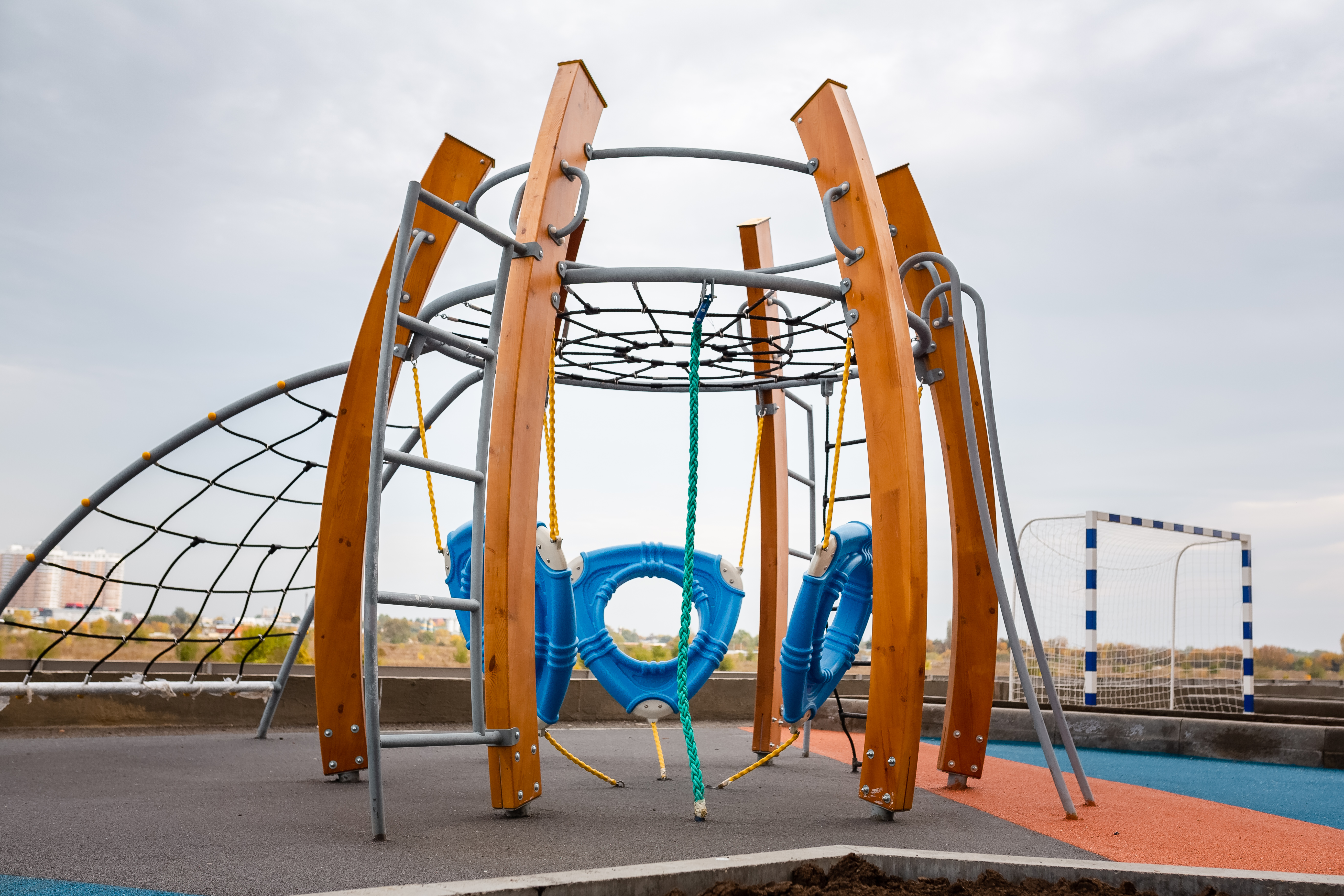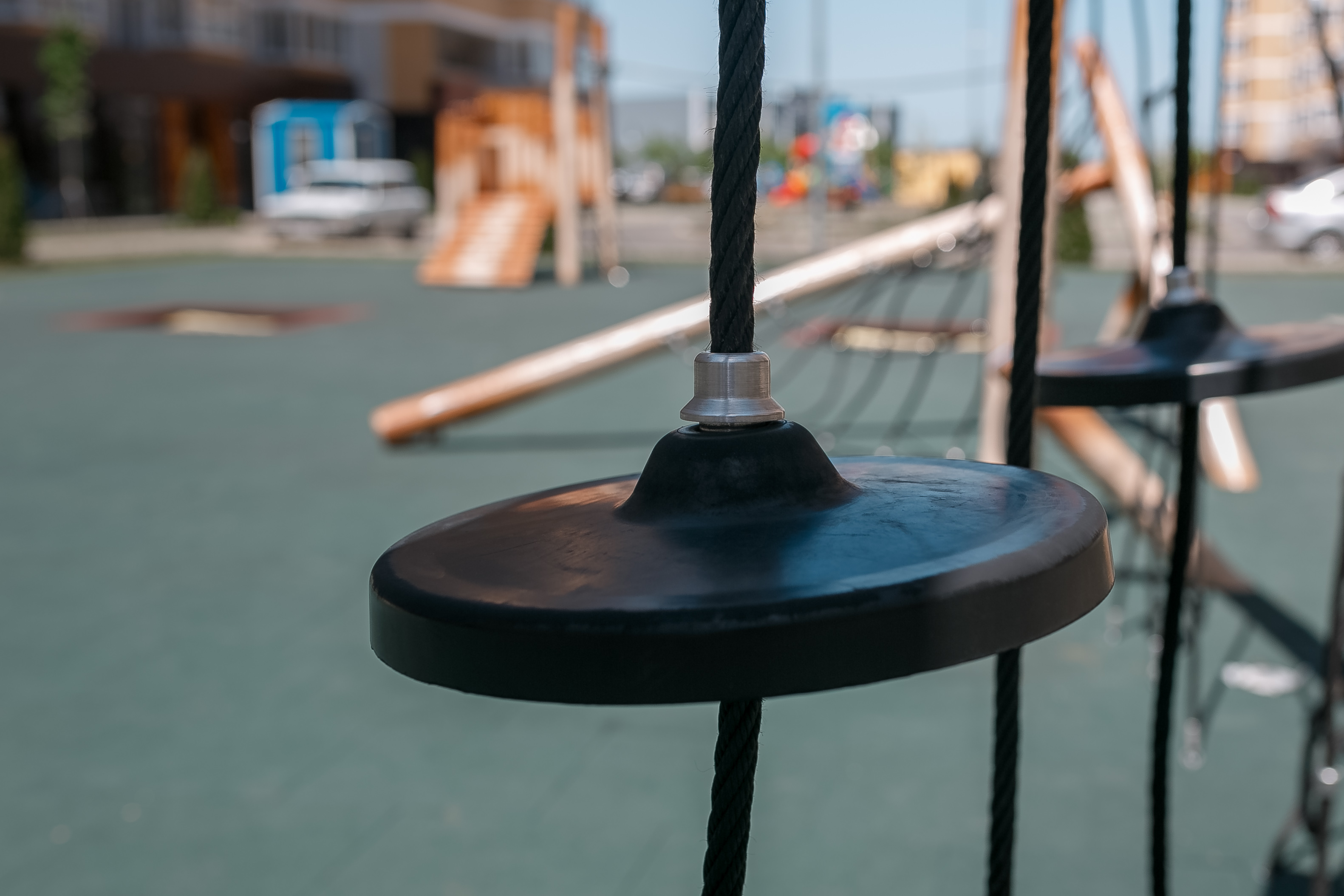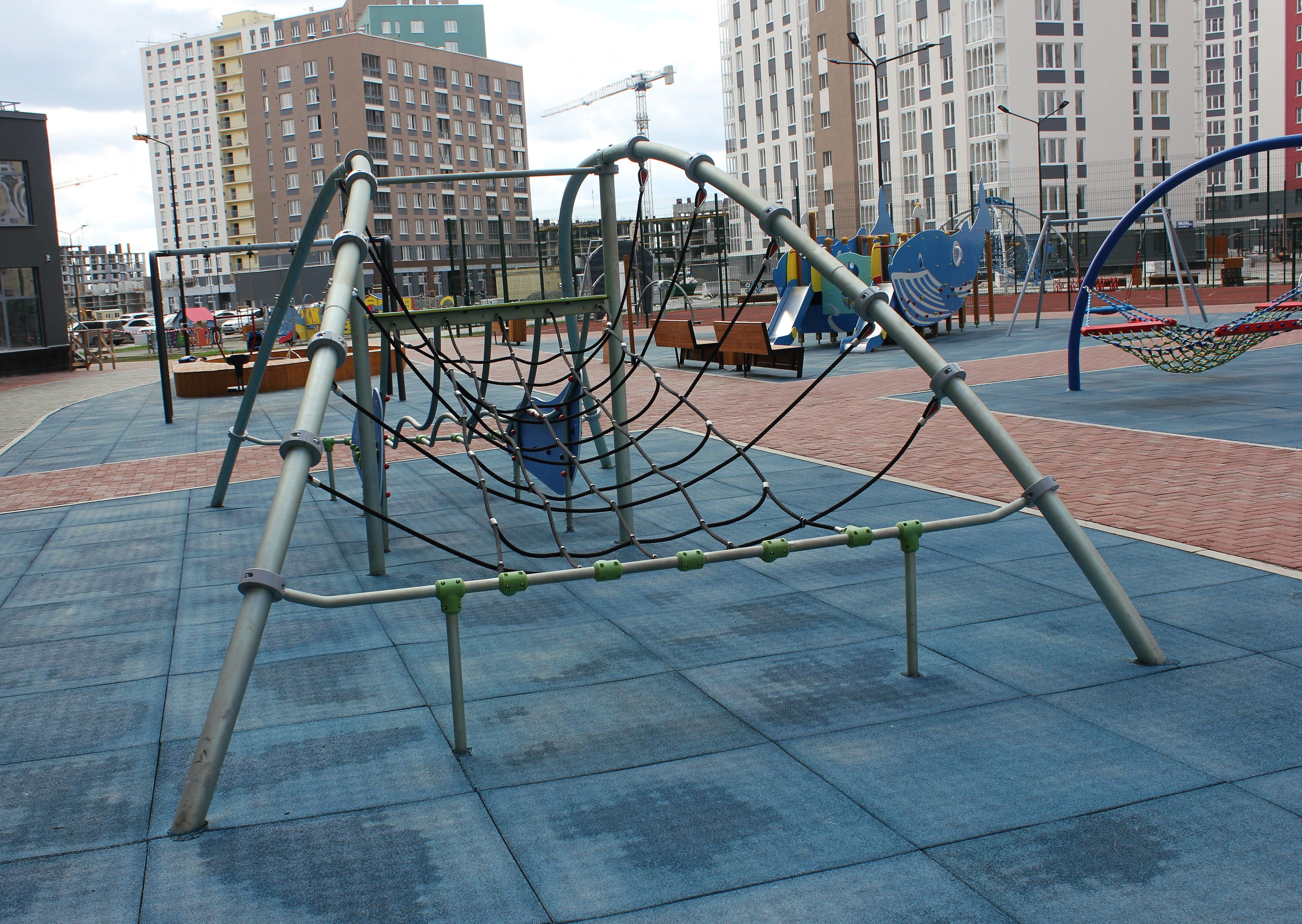 - Мягкие зоны приземления: Вокруг конструкции должна быть зона безопасности с мягким покрытием (например, резиновая крошка или искусственный газон) для смягчения падений и ударов.